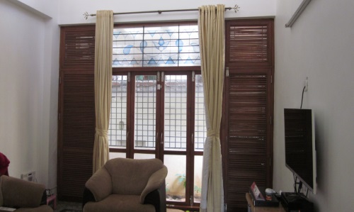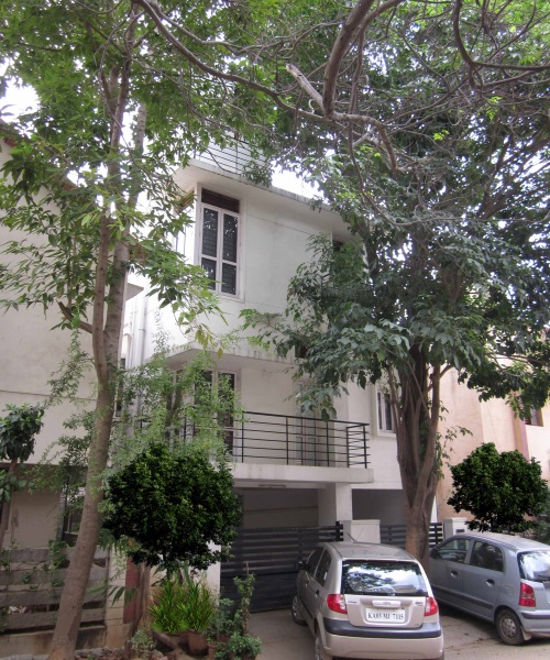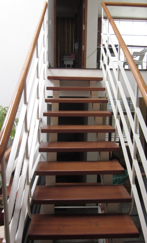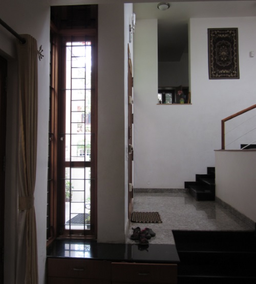 The two and a half storied structure is volumetrically composed in split levels is in accordance with the site topography. The staircase fabricated out of steel and wood is hung in the middle of the house, which forms as the central vertical spine.